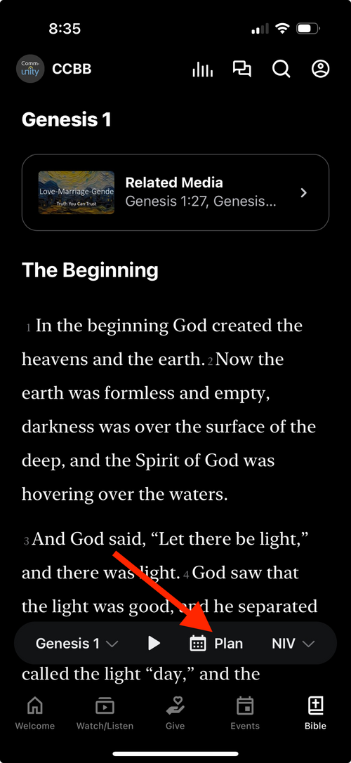 After opening the Bible screen, tap the Calendar icon labeled "Plan" to open the list of scheduled readings.
