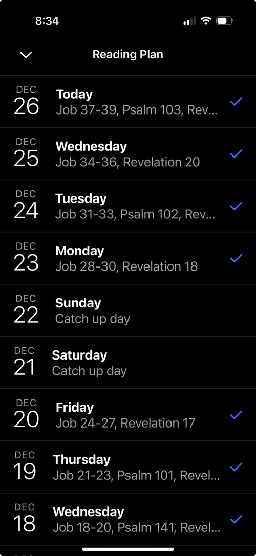 Tap the day you want to read and check it off when completed. You can also tap the play button on each day's reading and have the verses read aloud to you.